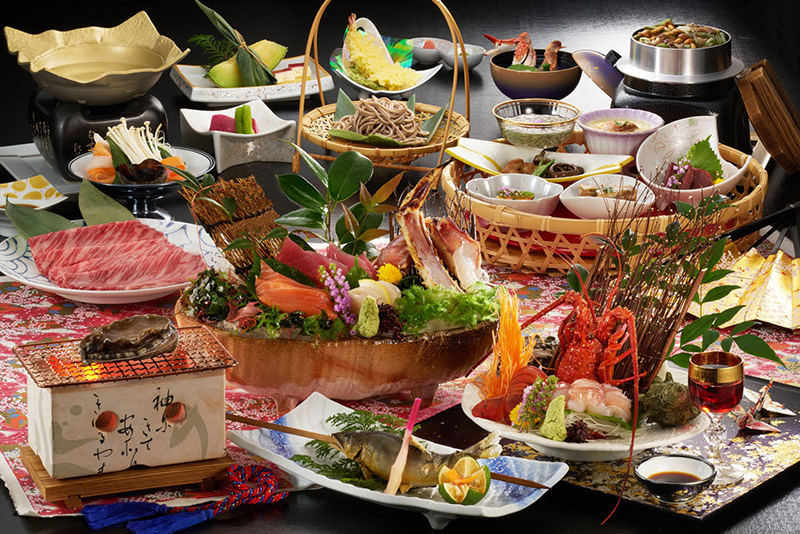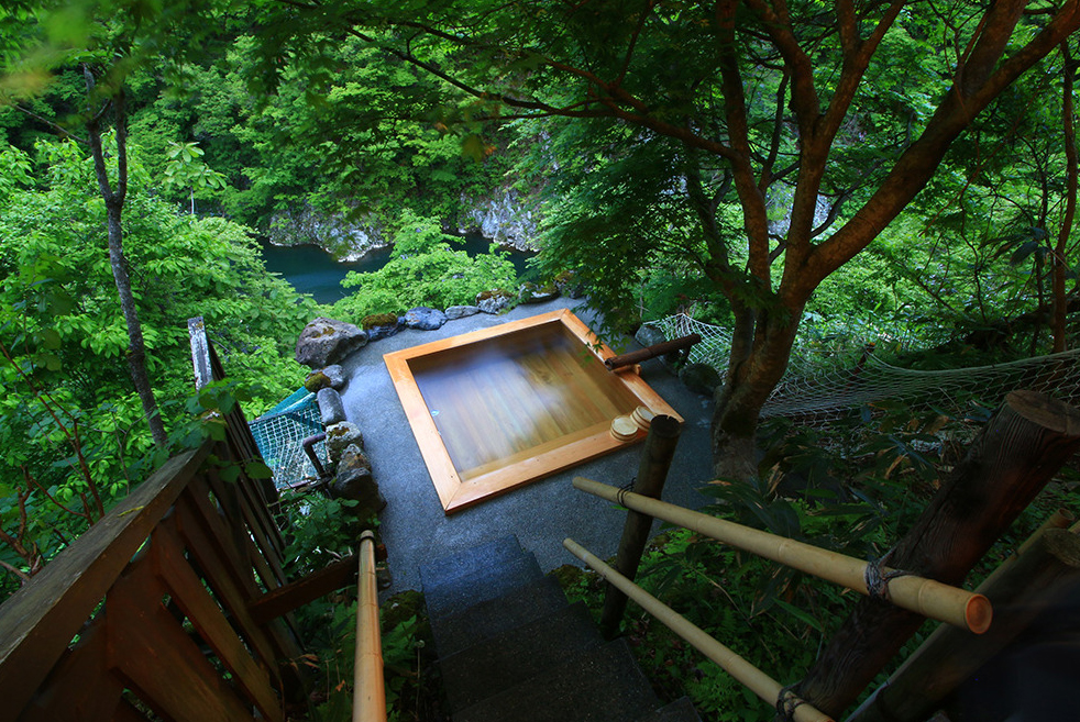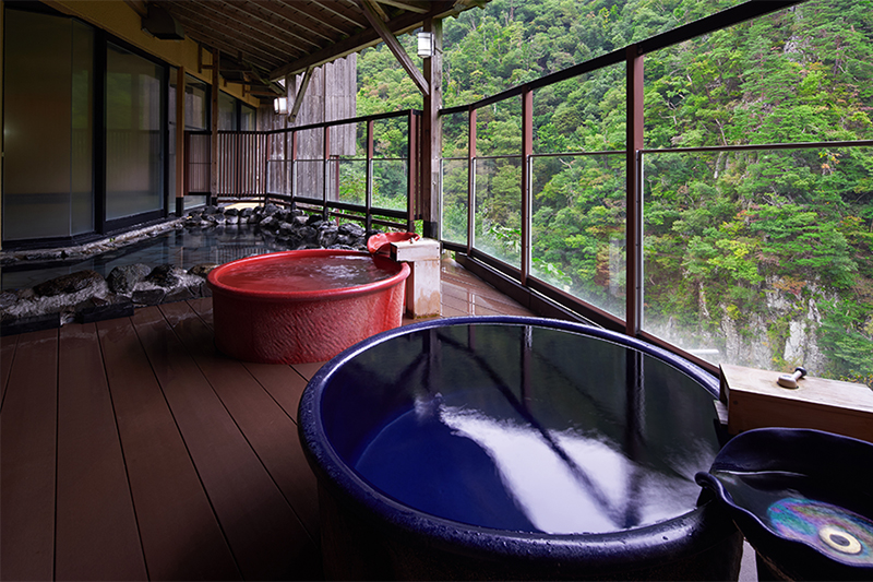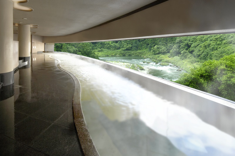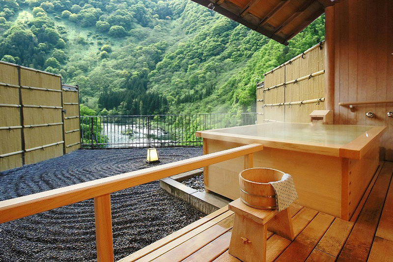 It is located in a place where the clear stream of the Okawa River meanders widely, forming a beautiful ravine, and on the other side of the river, you can see the mountains that change from season to season. The inn is proud of its cuisine, which focuses on seafood directly from the sea. The open-air bath is about 50 meters above the surface of the river. You can enjoy the beautiful flow of the river far below you.