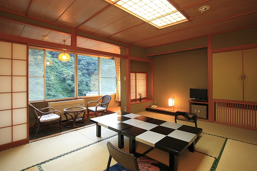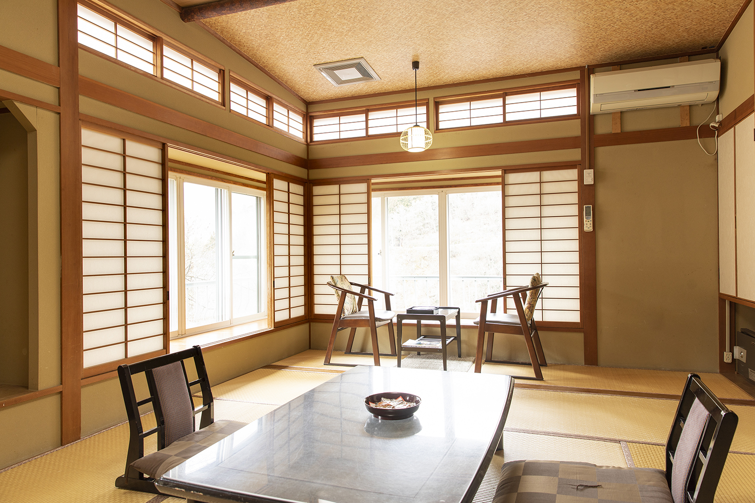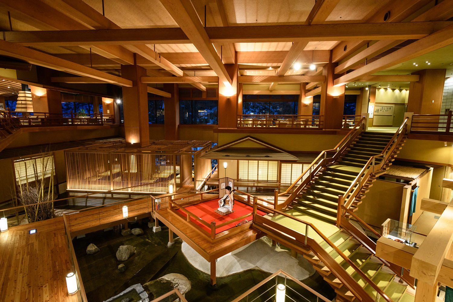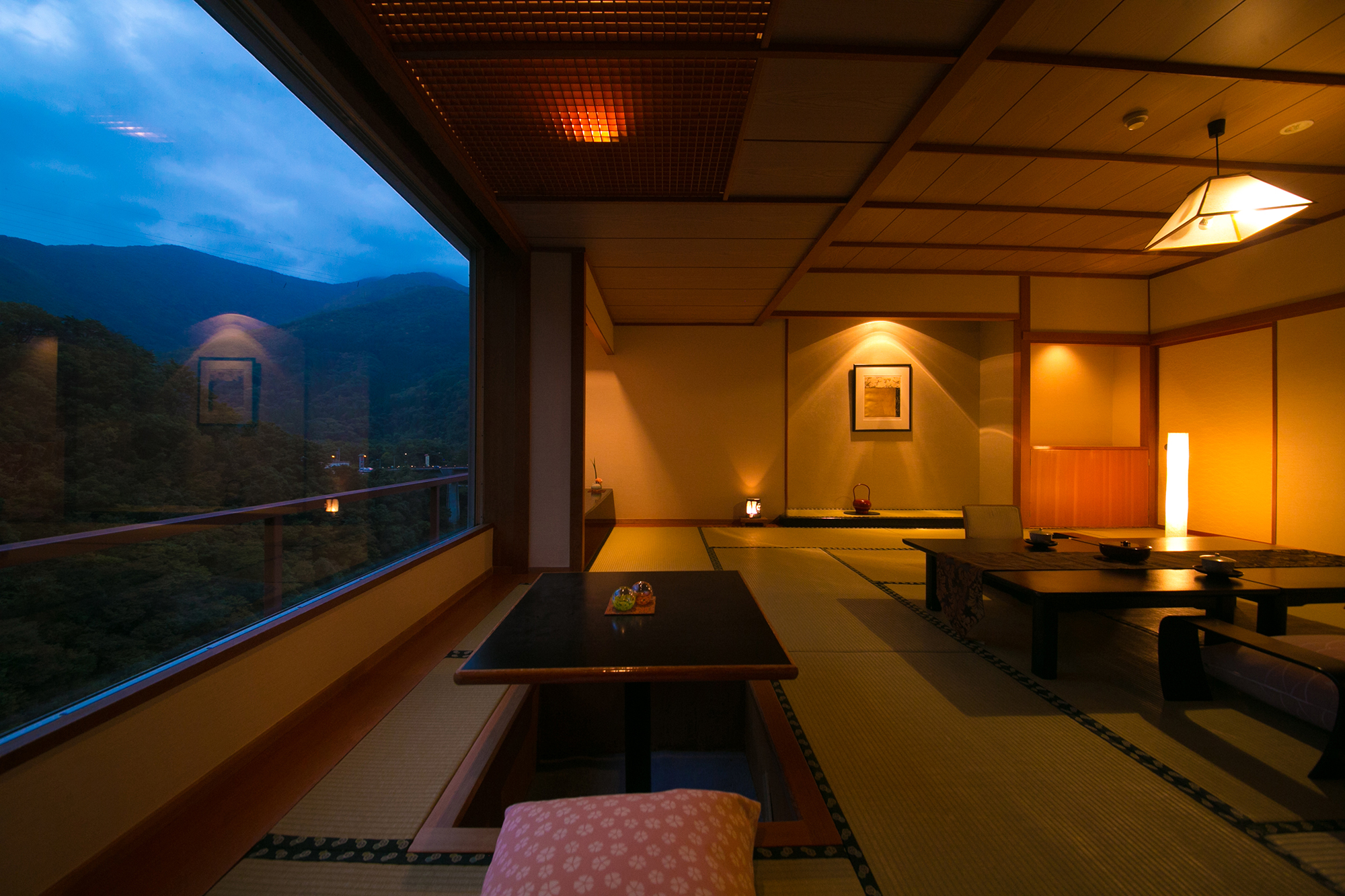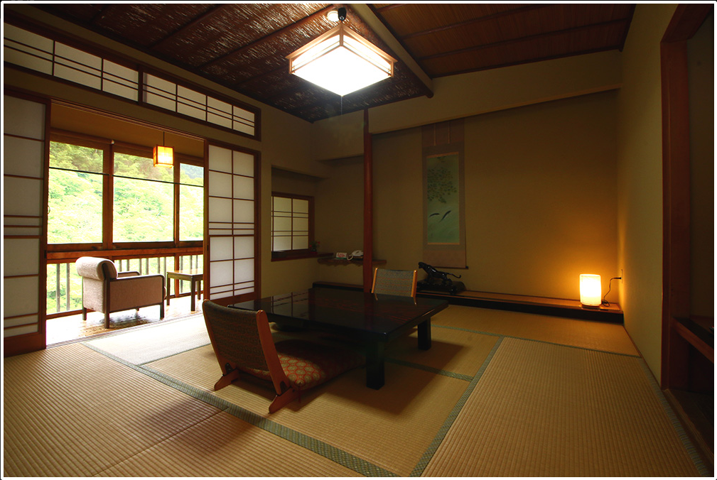 An inn with a beautiful atmosphere, where the sound of shamisen (three-stringed Japanese banjo) and the murmuring of the river echo in the Japanese room space.