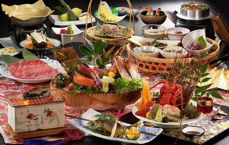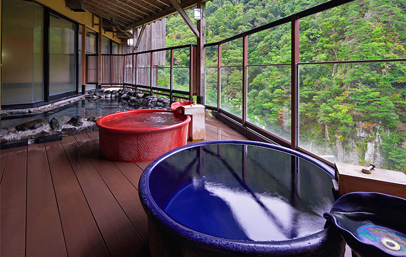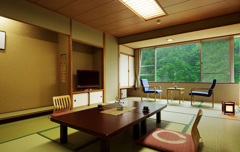 大川の清流が大きく蛇行する美しい渓谷美を形成する場所に位置し、対岸には四季折々に変化する山が望まれます。産地直送の海の幸を中心とした料理自慢 の宿。
