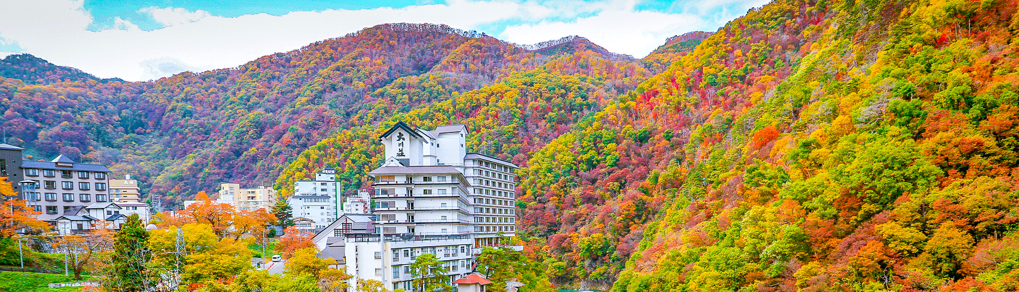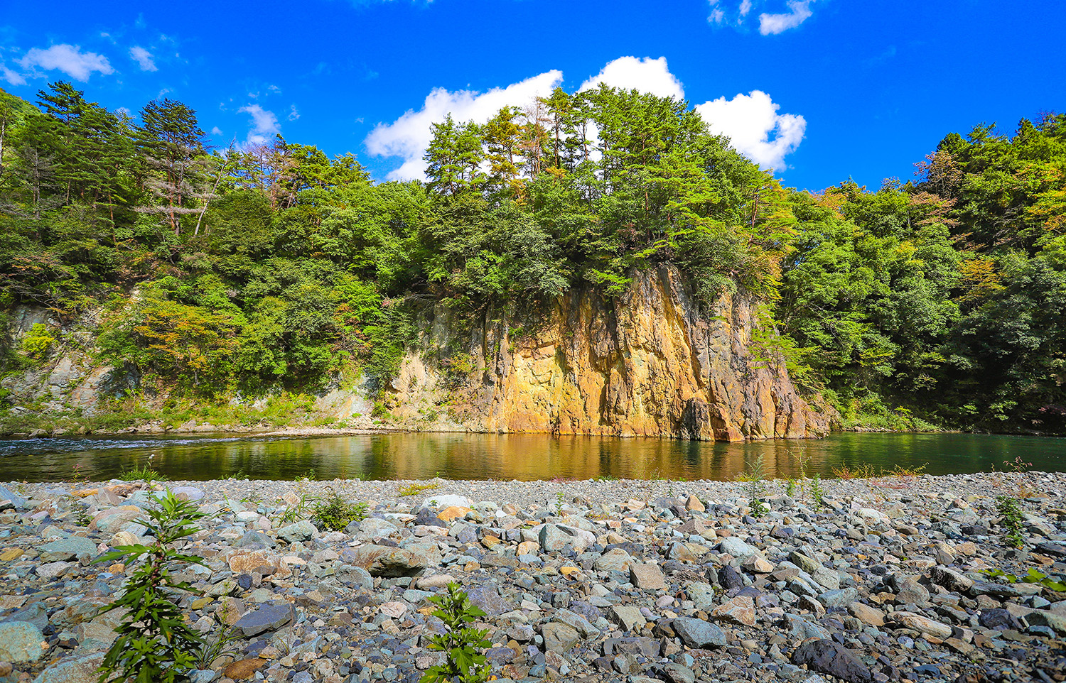 芦ノ牧温泉を囲むように流れる渓谷阿賀川。ゆったりとした曲線、川面のエメラルドグリーンは美しく、癒やしの時間を与えてくれます。近くにはパークゴルフ場もあります。